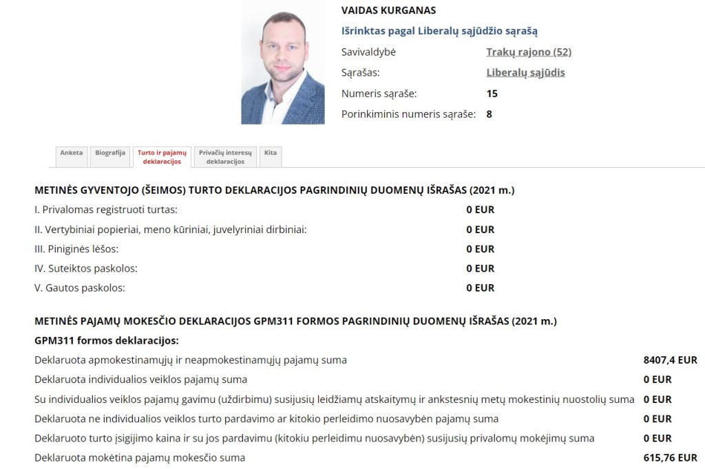 Savivaldos rinkimų sąraše greta Trakų rajono šviesulio – Trakų Vytauto Didžiojo gimnazijos direktorės Jolantos Martyncevienės suspindęs V. Kurganas, nespindėjo nei savo biografija ( ji buvo visai tuščia), nei turto deklaracija.