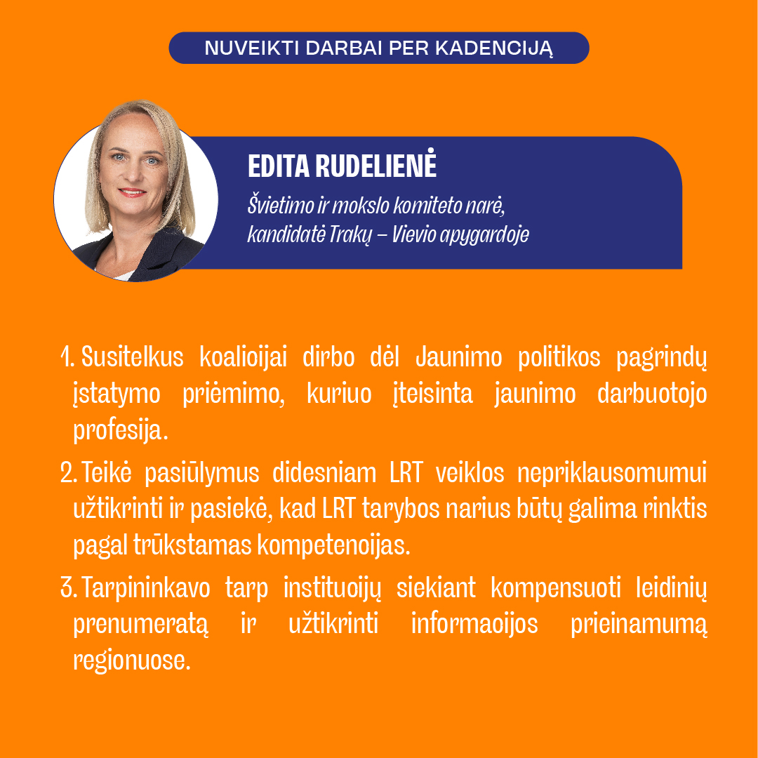 Ai, tiesa, buvusi Trakų rajono merė E. Rudelienė tada postringavo, kad būdama Seime ji daugiau galės save realizuoti ir daugiau savo kraštui nuveikti lyg jau Trakų rajonas būtų buvęs sutvarkytas bei iščiustytas lyg koks Birštonas.