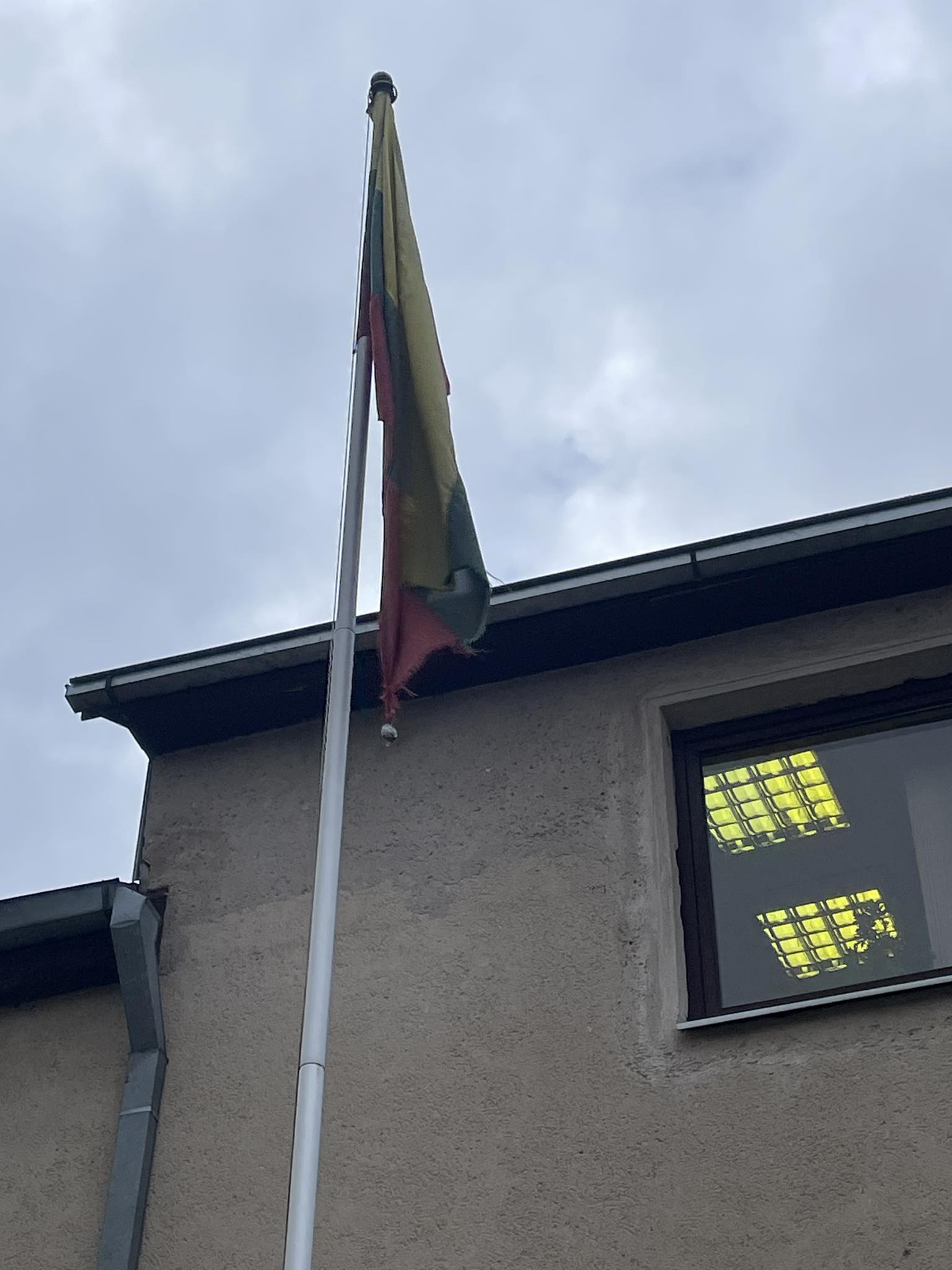 Tai štai „pasigėrėkime“ prie Nacionalinės žemės tarnybos Trakų skyriaus pastato Birutės gatvėje plevėsuojančia apgailėtinos būklės trispalve.