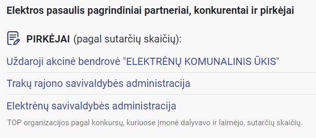 „Elektros pasaulis“ tiekia ir sniego valymo paslaugas už kiek daugiau nei 5 000 eurų, kelių ir gatvių valymo bei barstymo paslaugas už 2 000 eurų, kažkokius nedetalizuojamus remonto darbus už 3 400 eurų, gali atvežti smėlio ar žvyro už beveik 2 500 eurų, demontuoja gelžbetonines atramas už kiek daugiau nei 5 000 eurų. Kitaip tariant, beliko tik išmokti tortus kepti ir maisto tiekimo paslaugas teikti švietimo įstaigoms.