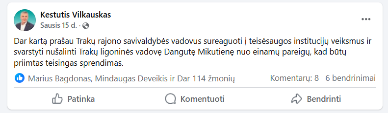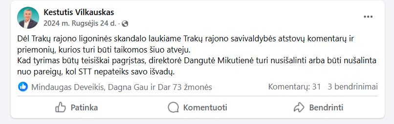 Neseniai K. Vilkauskas paragino vietos valdžią nuo pareigų nušalinti neskaidrią Trakų ligoninės direktorę Dangutę Mikutienę, kuriai pareikšti įtarimai baudžiamojoje byloje dėl turto pasisavinimo, dokumentų klastojimo ir piktnaudžiavimo tarnybine padėtimi.